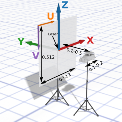 The laser spot on the reflector is in its centre which is also the origin of the coordinate system. All objects are contained within a volume in front of the reflector. As reference, the scene is available as download.